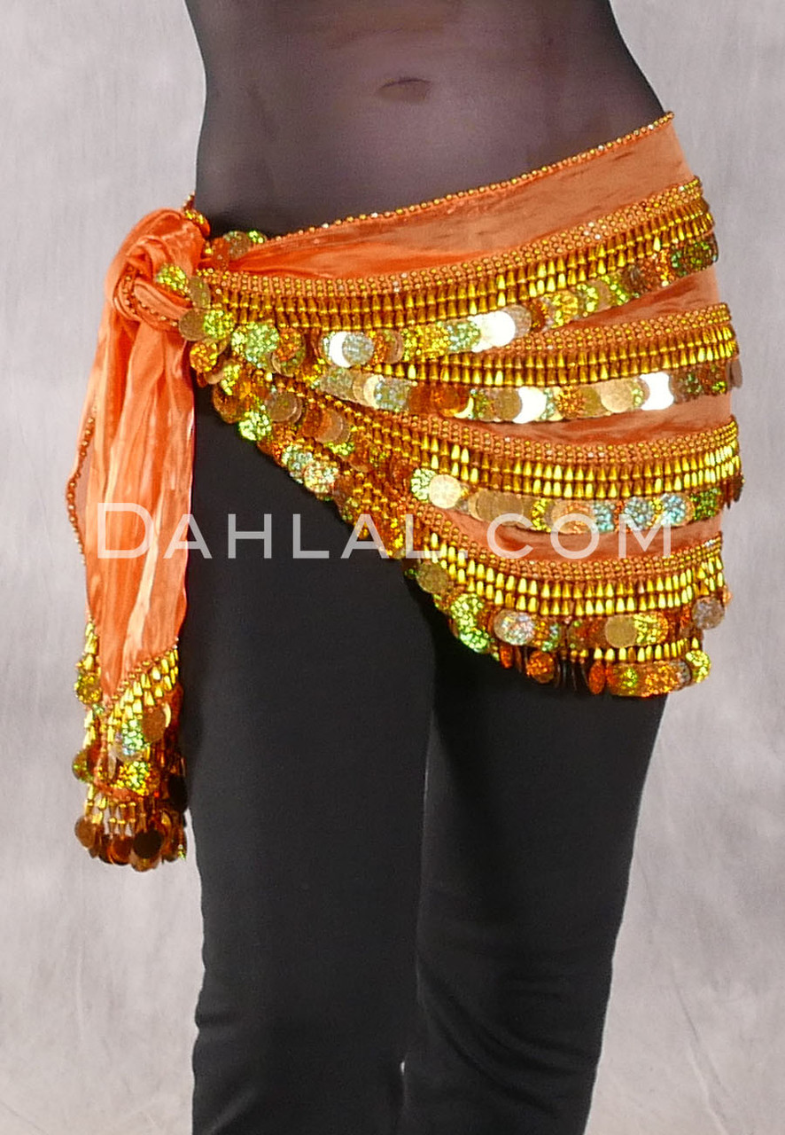 Four Row Egyptian Coin Teardrop Hip Scarf - Orange and Gold