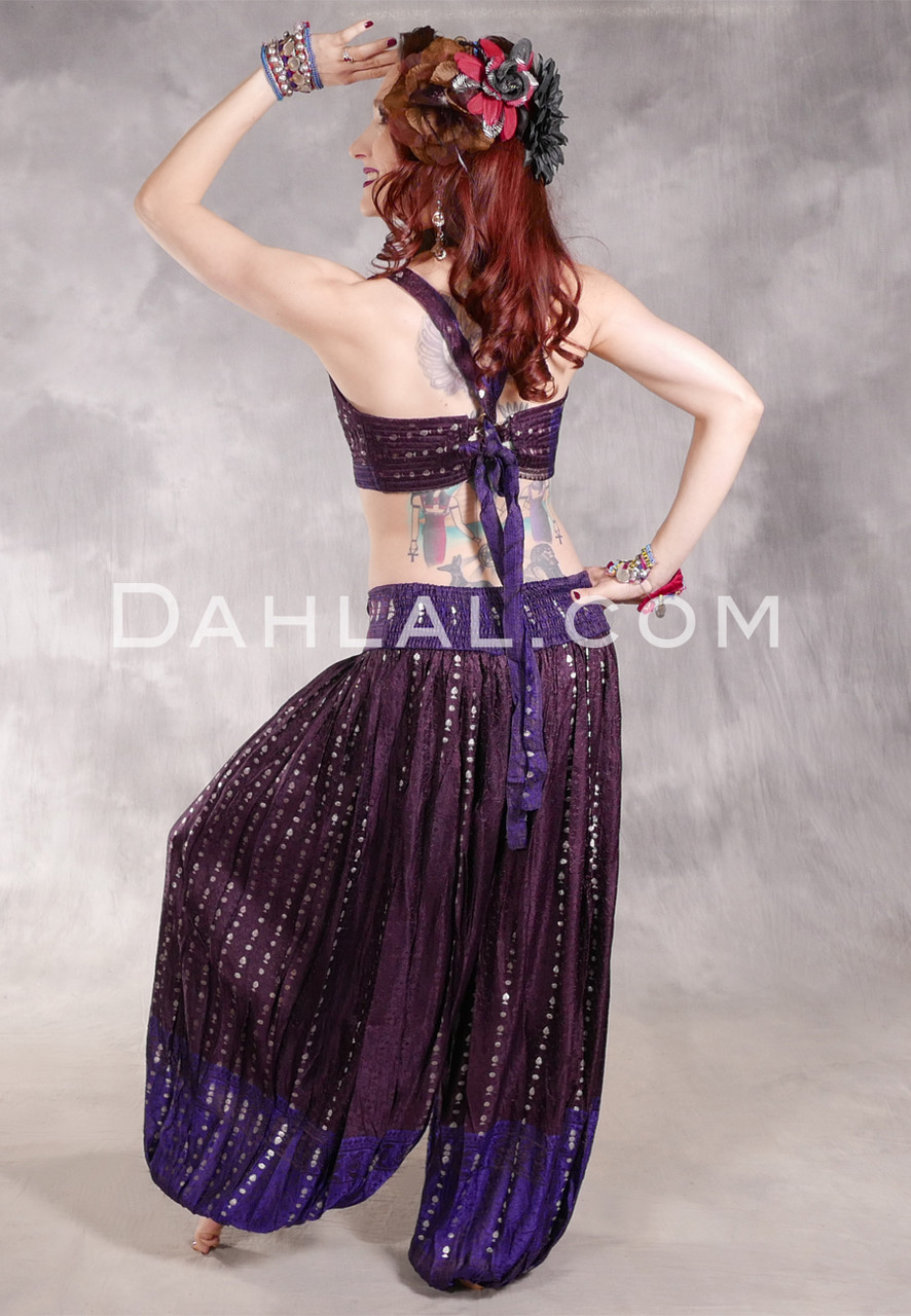 - Voluminous plum, purple and silver harem pants and tie back halter can be paired with so many dance wear pieces.