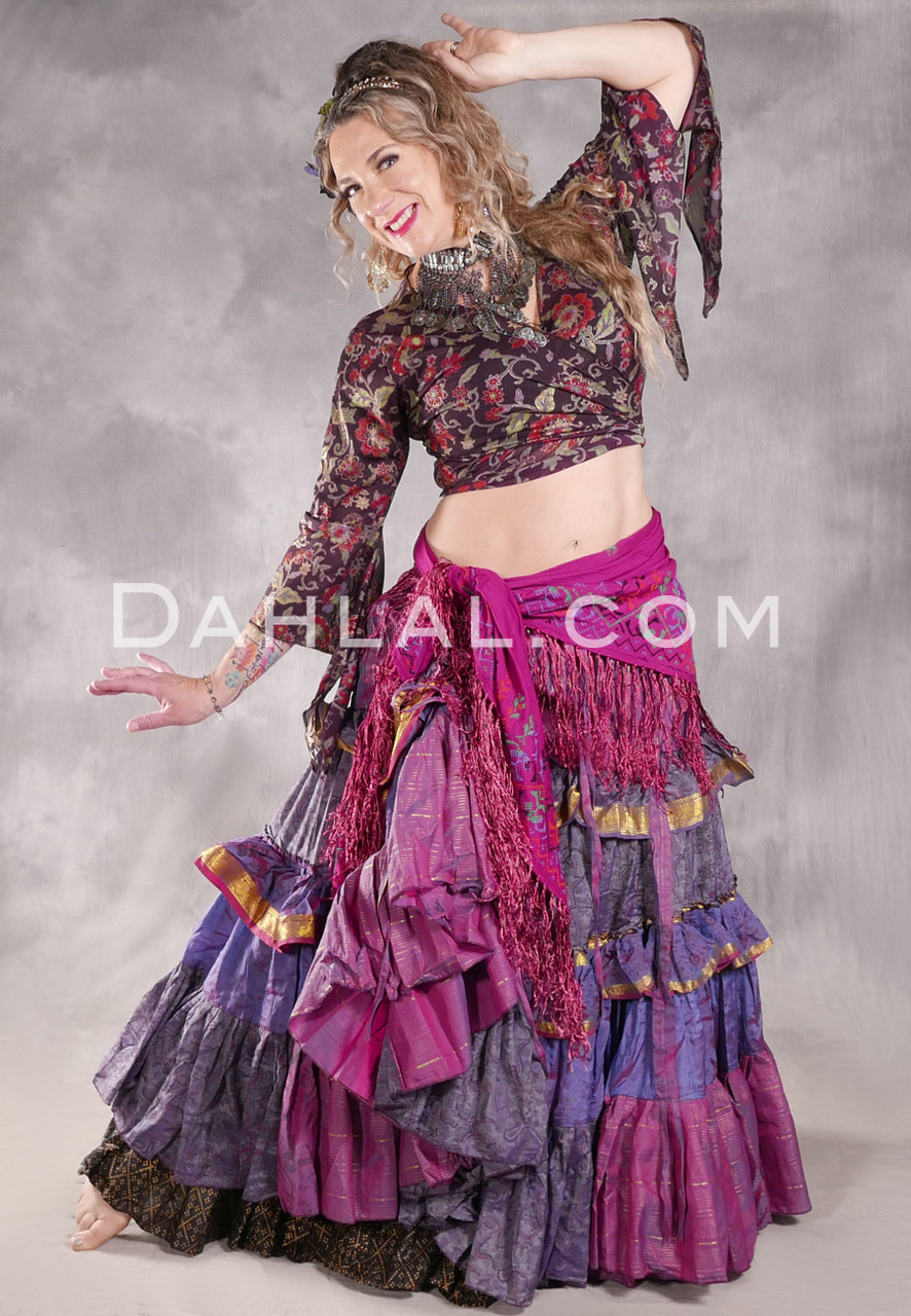 - Includes one extra-full belly dance skirt in dusty magenta, blue iris, steele and gold color combination, Skirt #26-01. NOTE: A Black and Gold Faux Assuit I Cotton 25 Yard Tiered Skirt is worn underneath each Moon Flower Skirt. Printed Samira Wrap Top and Bedouin Shawl sold separately on Dahlal.com.