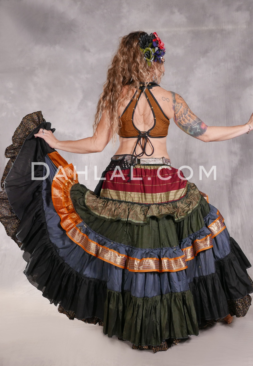 - Includes one tiered 25 yard skirt in a forest green, red, steel blue, black, goldenrod and gold color combination #26-17 made from 100% silk. Desert Moon Sari Brocade Bra Top, Mirage Two-Pocket Sari Belt and Black and Gold Faux Assuit Cotton 25 Yard Tiered Skirt sold separately on Dahlal.com.