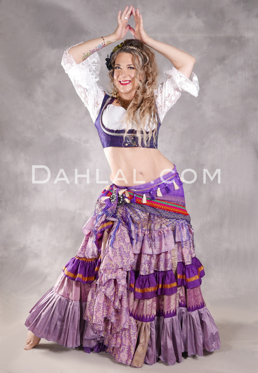 - Includes one tiered 25 yard skirt in a Lavender, Purple, Tan, Gold and Silver color combination #26-08 made from 100% silk. Ivory Cotton Peasant Top, Athena Rising Underbust Vest, Purple Tassel and Fringe Hip Shawl and Purple Cotton 25 Yard Tiered Skirt sold separately on Dahlal.com.