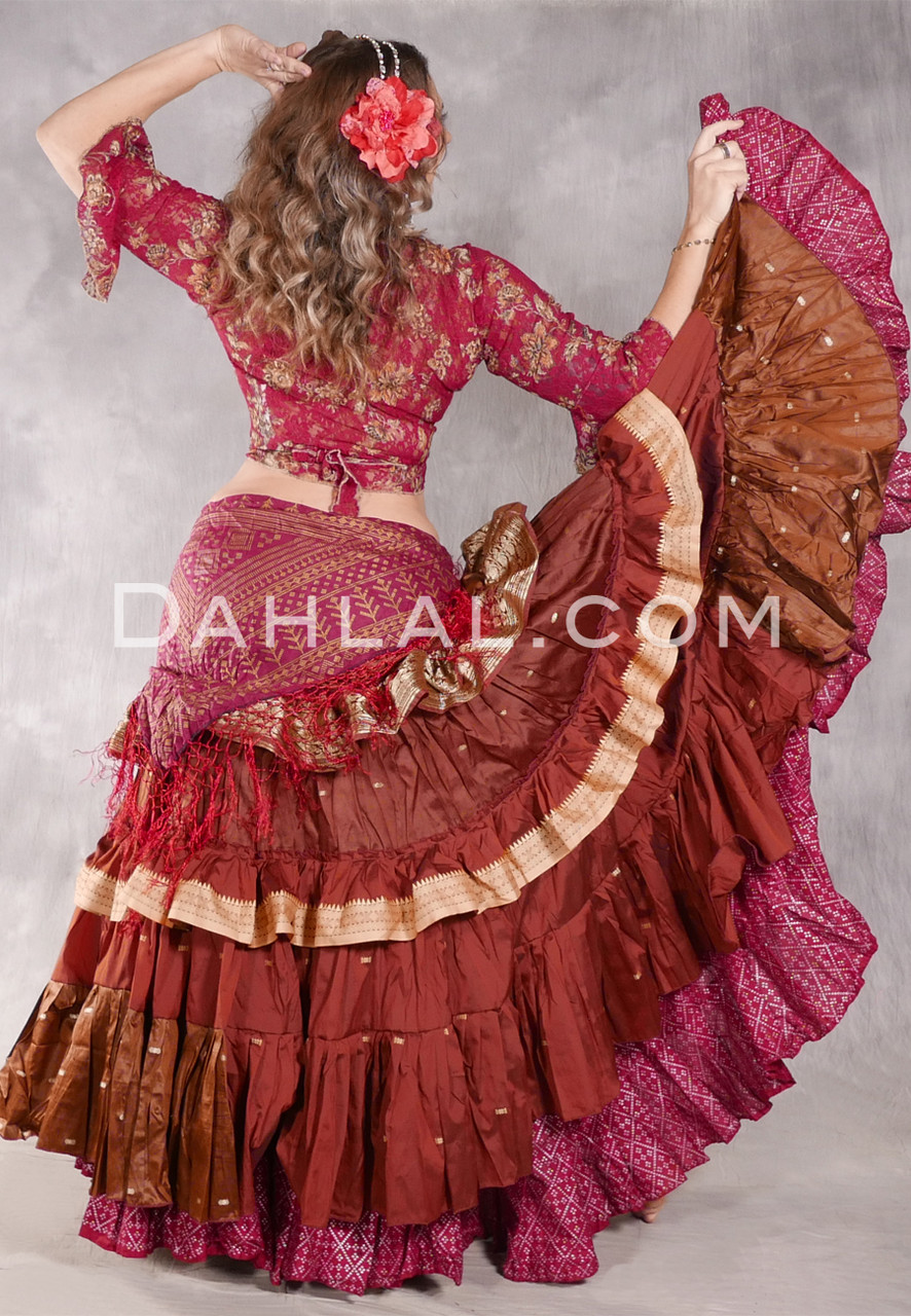 - Includes one tiered 25 yard skirt in a rust, copper, brown and gold color combination #25-121 made from 100% silk. Sahara Wrap Top, Faux Assuit Fringe Shawl and Wine and Silver Faux Assuit Cotton 25 Yard Tiered Skirt sold separately on Dahlal.com.
