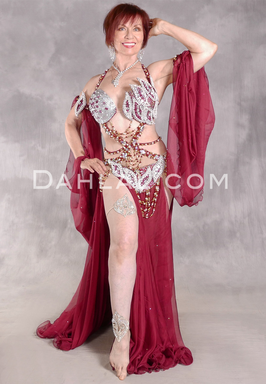 - Belly dance outfit includes Egyptian bra and skirt in a high quality chiffon and wine lycra with attached embellished nude lycra and mesh undershorts and two matching sleeves.