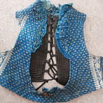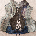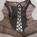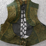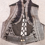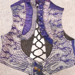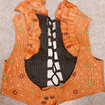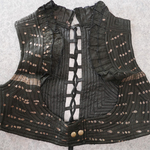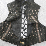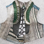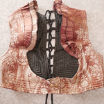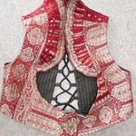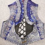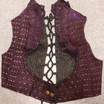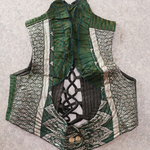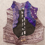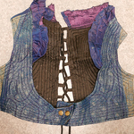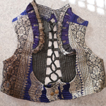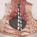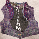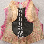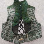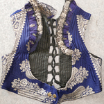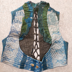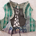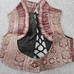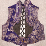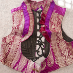 Each of these beautiful vintage sari under bodice vests are one-of-a-kind and feature a double snap closure at the center front making them an easy quick change accessory. The back can be adjusted to fit multiple sizes by opening or closing the crisscross lacing from neckline to bottom hem.
